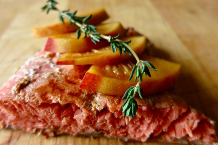 - Grilled wild caught Alaskan salmon. Salmon is marinated and cooked in brown sugar, seasonings and topped off with nectarine slices and fresh herbs from the garden giving the salmon a perfect sweet and savory flavor.