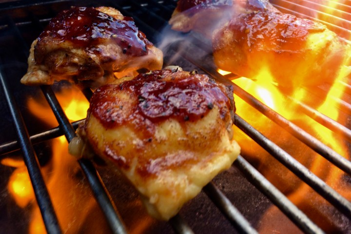 - Bone-in chicken thigh marinated and cooked in BBQ sauce, vinegar, and seasonings. Then finished on the charcoal grill for a perfect smokey, sweet, and tangy flavor.